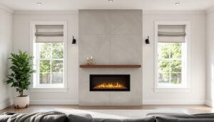 A fireplace centered between two symmetrical windows creates one of the most balanced and visually